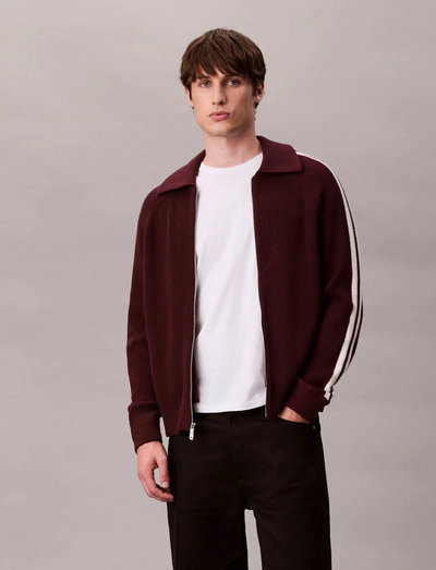 Gerippte Strickjacke mit sportlichen Streifen an den Ärmeln. Dieser Cardigan mit durchgehendem Reissverschluss hat einen klassischen Kragen und ist aus einem angenehmen Feinstrick gefertigt.
