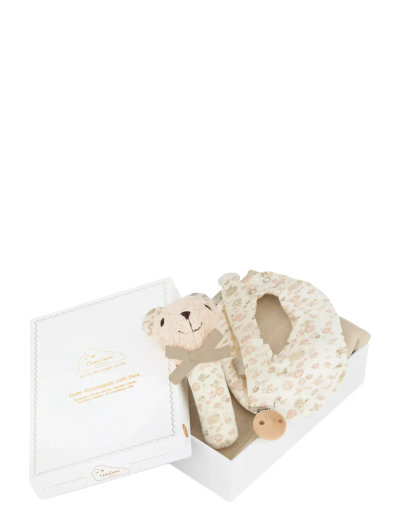 Beautifully printed Baby Essentials Gift Box offering a varied selection of bestselling baby must-haves; 1 Muslin Cloth, 1 Pacifier Holder, 1 Bandana Bib, and 1 Petite Rattle.