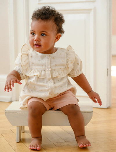 Dises bezaubernde Bluse besticht dur e fliessende Schnitt, verspielti Rüsche und en zarte Blumendruck in Gold. Si isch us weicher, GOTS-zertifizierter Bio-Baumwolle gfertigt und verfügt über e grüschti Passe sowie churzi, flatterndi Ärmel. Es vielsytigs Kleidigsstück, das sich sowohl für de Alltag als auch für festlichi Aläss eignet. Für en abgstimmtä Look laht si sich ideal mit Bloomers, Shorts oder Hose kombiniere.