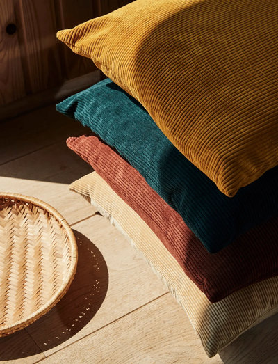 Trendy cut & sew corduroy cushion. comes with visible brass metal zipper.
