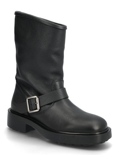 Diese Stiefeletten mit robuster Silhouette verfügen über einen markanten Schnallenriemen und eine robuste Profilsohle. Das strukturierte Leder sorgt für einen Hauch von Robustheit und macht sie zu einer vielseitigen Wahl für den Alltag.