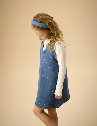 Denim spencer from Creamie. This spencer has a V-neck with cut&sew at the front and back. The dress has rhinestones at the front.