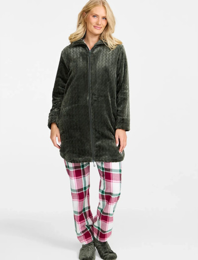 Damella's long jacket in jacquard fleece is designed with a two-way zipper and pockets. It can also be used as a shorter robe, perfect for comfort and warmth.
