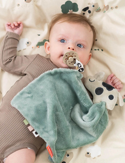Diese superweiche Decke wurde entwickelt, um Ihrem Kleinen Komfort und Geborgenheit zu bieten. Sie verfügt über verschiedene Texturen und verspielte Etiketten zur Anregung der Sinne sowie einen praktischen Clip, um einen Schnuller in der Nähe zu halten.