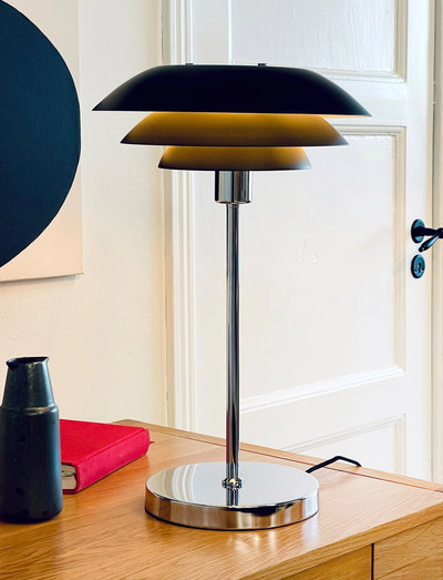 DL20 Table lamp with chrome/metal base and black metal shades, is a nice table lamp that is very elegant on, for example, the desk, on a small side table in the living room, or wherever you need it. The light is directed through the 3 different sized screens, and gives a cozy atmosphere in the room. Due to the placement of the screens, the light does not dazzle, but instead creates a cozy atmosphere.