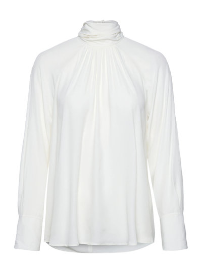 Diese Bluse mit raffinierter Silhouette zeichnet sich durch ein besonderes Detail mit Bindeband am Hals aus. Das Design umfasst elegante Raffungen am Kragen vorne mittig, ergänzt durch hohe Manschetten mit Einknopfverschluss und Raglanärmel.