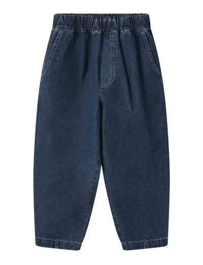 Long denim trousers with elastic waist, side seam pockets to hide the exciting things the child finds along the way. The trousers have a lot of volume and a pegged cut which makes them comfortable to wear, but also easy to play in.
