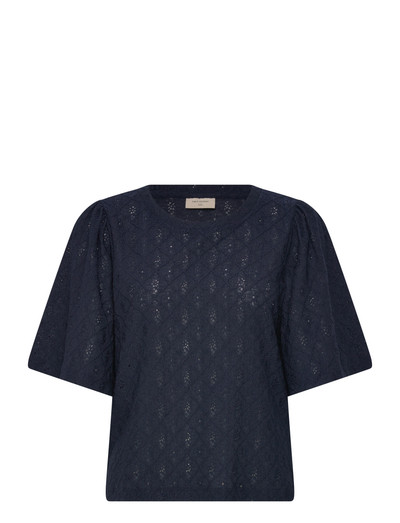 Dieses weiche Poloshirt besticht durch ein gesticktes Lochmuster, das für eine dezente Struktur sorgt. Es zeichnet sich durch ein schlichtes Design aus, das durch einen runden Ausschnitt sowie weite, dreiviertellange Puffärmel ergänzt wird.