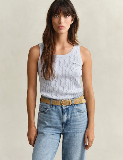 Dieses Tanktop mit klassischem Zopfstrickmuster verleiht Ihrem Look einen Hauch von Struktur. Es ist schmal geschnitten und hat einen Rundhalsausschnitt sowie einen gerippten Saum. Abgerundet wird es durch eine aufgestickte Grafik auf der Brust.