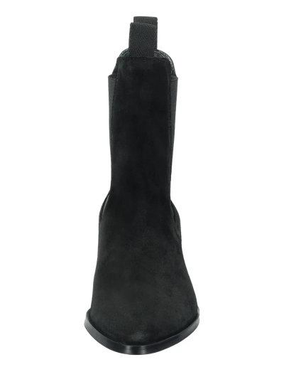 Ein spitz zulaufender Zehenbereich und ein Blockabsatz verleihen diesem Ankle-Boot eine ausgesprochen feminine Silhouette. Gefertigt aus Wildleder, mit breiten elastischen Einsätzen, einer lederbezogenen Innensohle und Textilfutter.
