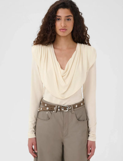 Elegante Drapierungen definieren dieses langärmlige Oberteil und schaffen eine raffinierte Silhouette. Der weiche Stoff und die entspannte Passform machen es zu einer bequemen und dennoch stilvollen Wahl für jeden Anlass.