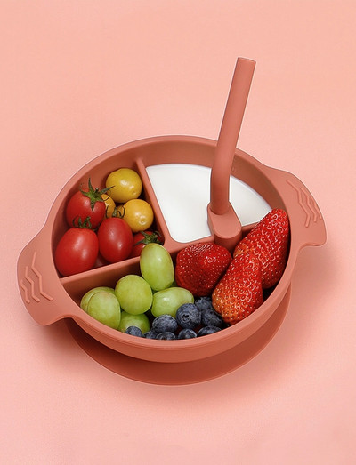 Diese Schüssel mit drei Fächern ist ideal, um verschiedene Speisen für Ihr Kind getrennt und organisiert aufzubewahren. Sie ist aus 100 % lebensmittelechtem Silikon gefertigt und somit eine sichere und praktische Wahl für die Mahlzeiten. Der mitgelieferte kurze Silikonhalm kann befestigt werden, sodass Kinder direkt aus der Schüssel trinken können. Mit einer Schnellverschlusslasche an der Unterseite ausgestattet, lässt sie sich einfach und sauber vom Tisch entfernen.