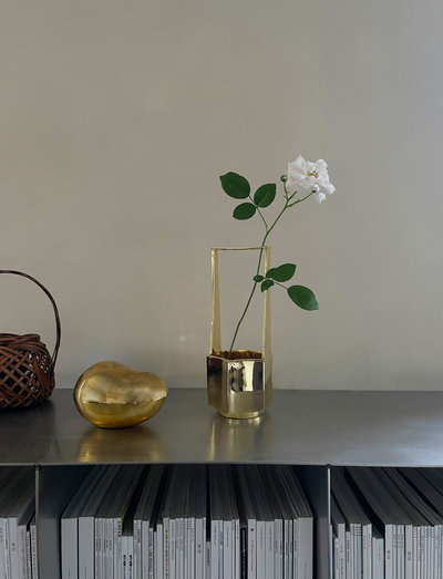 Giving life to flowers is the exact translation of Ikebana. Ikebana was introduced in japan in the 6th century. An Ikebana flower arrangement should contain aesthetic elements or a triangular structure that symbolizes heaven, earth and the humanity existing in harmony. ”I designed ikebana vase from a fascination of giving life to a single branch or a few stems. Making it easy to arrange small art pieces at home” The Vase is made in solid brass and its shape is inspired by Japanese ceramics techniques giving each angle life when seen from a new perspective.