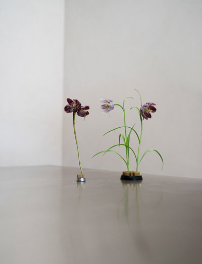 Kenzan is a small tool used in Ikebana, the Japanese art of flower arranging. Also known as a "spiky frog" due to its appearance, it consists of a heavy lead plate with upright brass needles. The stems of flowers and plants are fixed onto these needles, allowing for precise and artistic positioning within a small vase or bowl and cover in water.