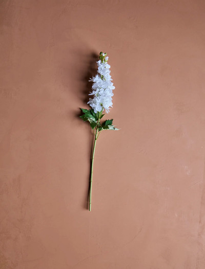 A tall artificial delphinium stem with elegant white petals and a lifelike structure.