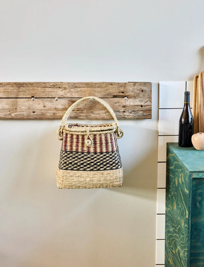 Handwoven seagrass basket with lid and handle. Features a geometric woven pattern in natural and brown tones.