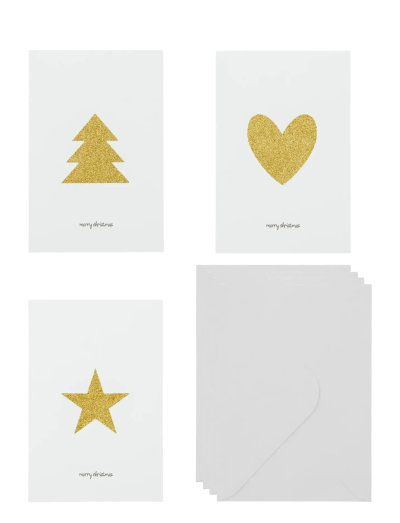 Bring a touch of elegance to your festive greetings with this exquisite set of greeting cards. Crafted from high-quality white paper, these small folded cards feature three beautiful designs adorned with golden glitter. Each set includes six cards, each paired with a matching white envelope. Perfect for adding a heartfelt note to gifts for your loved ones.- Set of six cards- Three unique festive designs- Golden glitter print- Includes matching envelopesAdd a personal touch to your Christmas presents with these charming greeting cards.