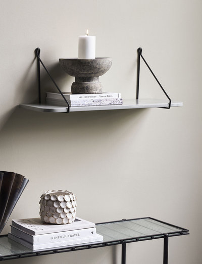 Open shelving is a practical and not least stylish way of keeping your belongings on display. rib from house doctor is a mango wood shelf finished with grey paint and lacquer for a wonderful shine. a simple, solid and elegant solution for any contemporary home décor in need of space for trinkets, vases and candle holders. the shelf is made to look worn which is why the wood grain is somewhat visible underneath the lacquer. combine with shelf supports and place the shelf in your living room, bedroom or kitchen. also available in a longer version.