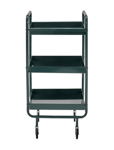 Bring style and functionality into your home with this dark green trolley, perfect for keeping your space organised. made from sturdy steel, its practical design includes a detachable tray for versatile use. with four smooth wheels, this trolley can easily be moved around your kitchen, home office, or living room, adding a touch of elegance wherever it goes. the sleek silhouette and deep colour make it a sophisticated addition to your interiors. sturdy steel construction rich dark green colour easy mobility with wheels detachable tray includedadd this elegant trolley to your home for efficient storage and style.