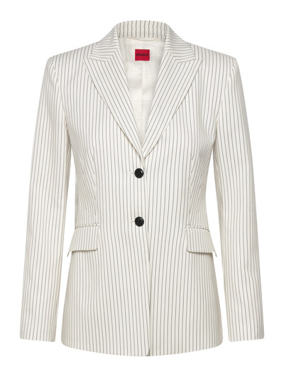 Ein Nadelstreifenmuster verleiht diesem Blazer einen Hauch von Eleganz. Das einreihige Design verfügt über ein fallendes Revers und einen Knopfverschluss, wodurch eine taillierte Silhouette entsteht. Es ist ein vielseitiges Kleidungsstück, das für verschiedene Anlässe elegant oder leger getragen werden kann.