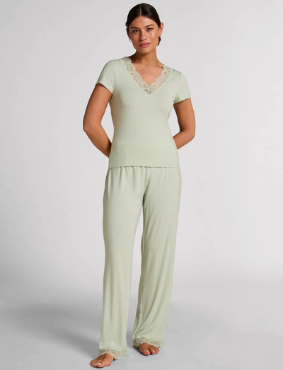 Erleben Sie ultimative Entspannung mit diesem weichen Pyjama-Set. Die Hose mit weitem Bein ist mit einer zarten Spitzeborte versehen und hat einen elastischen Bund für eine bequeme Passform. Das kurzärmelige Oberteil verfügt über einen schmeichelhaften V-Ausschnitt mit romantischen Spitzendetails und ist somit perfekt zum Entspannen.