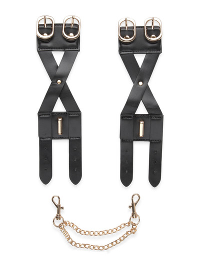 Diese Handfesseln mit überkreuzten Riemen und glänzenden Metallschnallen verleihen Ihrer Dessous-Kollektion eine kühne Note. Die aus glattem Kunstleder gefertigten Manschetten bieten eine verstellbare Passform für angenehmen Tragekomfort.