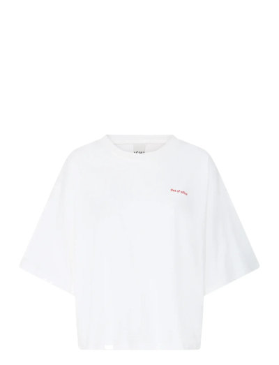 Mit seiner lockeren Passform und den kurzen Ärmeln bietet dieses Oberteil einen bequemen und lässigen Stil. Das dezente Textdetail sorgt für einen Hauch von Understatement und macht es zu einer vielseitigen Ergänzung für jede Garderobe.
