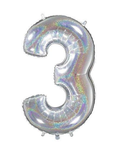 3+ JahreFoil balloon with holographic silver surface, number 3. Inflated size approximately 45 x 75 cm. The balloon can be filled with helium and will float for about a week. It can also be filled with air using a balloon pump and hung up with, for example, fishing line. The balloon has hanging loops at the top and bottom as well as an automatic valve for easy filling. It can also be emptied with a straw and refilled.