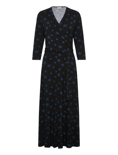 Dieses florale Wickelkleid aus weichem Viskose bietet sowohl Komfort als auch Stil. Das Design zeichnet sich durch ein schmeichelhaftes Wickeloberteil, einen ausgestellten Rock für eine anmutige Bewegung und eine definierte Taille aus, die durch einen abnehmbaren Gürtel betont wird. Abgerundet wird es durch feminine Dreiviertelärmel und einen wadenlangen Saum.