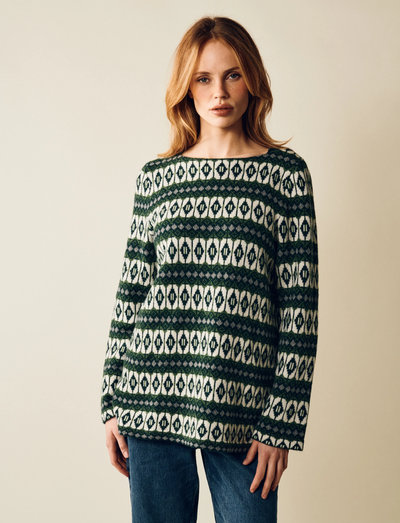Dieser gemusterte Pullover aus 100 % Lammwolle bietet sowohl Wärme als auch eine zeitlose Ästhetik. Das klassische Design zeichnet sich durch eine gerade Passform, lange Ärmel und einen schmeichelhaften, weiten Ausschnitt aus, was ihn zu einer vielseitigen Ergänzung für jede Garderobe macht.