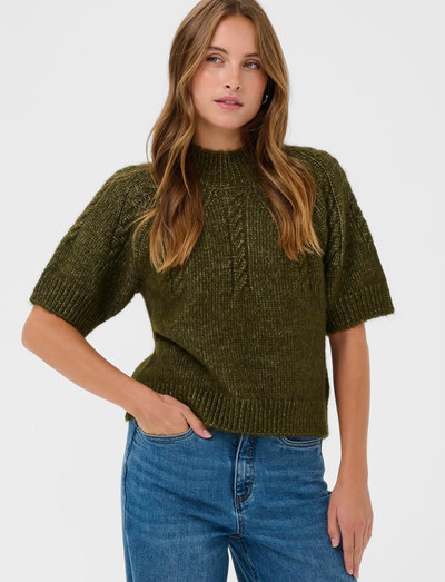 Dieser Pullover besticht durch sein strukturiertes Strickmuster und seine raffinierte Silhouette und interpretiert einen klassischen Stil auf elegante Weise. Das Design zeichnet sich durch einen hohen Halsausschnitt und kurze Ärmel aus, was ihn zu einem vielseitigen Kleidungsstück zum Layern oder zum Solotragen macht.