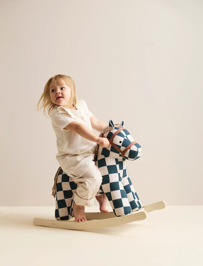 Miro wears a dark teal check-patterned coat and has a soft, strokeable mane and tail. The rocking base is made from FSC-certified wood, painted black on the sides. The seat is padded with recycled polyester filling and covered in cotton fabric for a natural surface feel. Designed for children from around 18 months and up, rocking toys are a fun way to support coordination, balance, and motor skills.