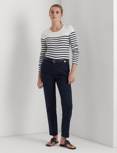 Diese Chinos mit bequemem Stretch und einer schmeichelhaften, schmalen Passform sind ein vielseitiges Basic für Ihre Garderobe. Die verkürzte Länge und das schmal zulaufende Bein sorgen für eine moderne Silhouette, während klassische Details wie schräge Vordertaschen und Paspeltaschen hinten einen Hauch von zeitlosem Stil verleihen. Abgerundet mit Gürtelschlaufen und einem Hosenschlitz mit Reissverschluss.