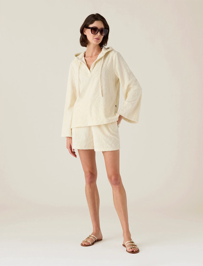 Dieses Kapuzenshirt aus weichem Bio-Baumwollfrottee bietet eine bequeme und entspannte Passform. Es verfügt über einen V-Ausschnitt und eine Kapuze mit Kordelzug, wodurch es sich perfekt zum Layern oder zum alleinigen Tragen eignet.