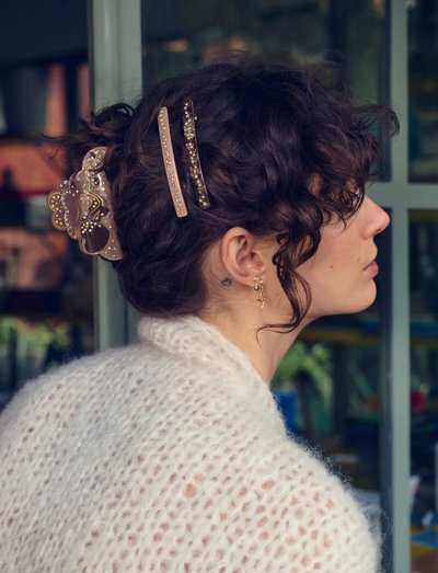 Zarte Kristalle zieren diese Haarspange und verleihen ihr einen subtilen Glanz. Dieses Accessoire verleiht jeder Frisur eine elegante Note und ist perfekt, um Ihrem Alltagslook einen Hauch von Glamour zu verleihen.