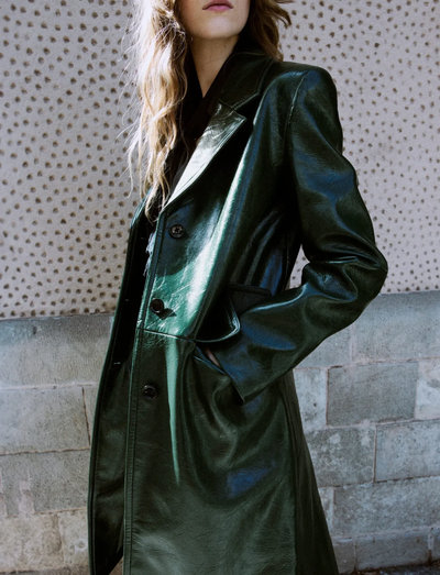 Faux leather, Long design, Straight Design, Lapel-collar V-neck collar, Lapel with notch, Long sleeve, Two pockets with flaps on the front, Front closure with buttons, Inner lining