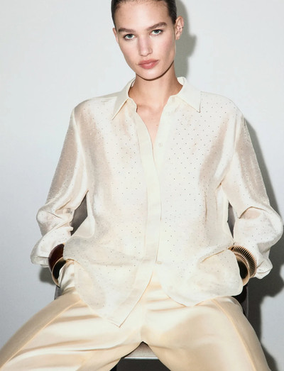 Dieses langärmlige Hemd aus glattem Satin ist mit zarten Strassdetails verziert. Das gerade geschnittene Design verfügt über einen klassischen Hemdkragen, geknöpfte Manschetten und eine verdeckte Knopfleiste. Als Teil einer Kollektion für besondere Anlässe wertet dieses Kleidungsstück jeden Look auf.