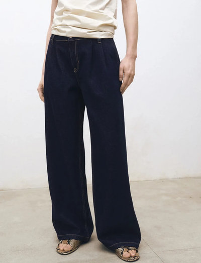 Diese weiten Hosenbeine haben eine schmeichelhafte Faltendetail an der Vorderseite. Sie sind aus einem bequemen Denim-Stoff gefertigt und haben ein klassisches Fünf-Taschen-Design. Die Jeans sind perfekt für einen lässigen oder eleganten Look.