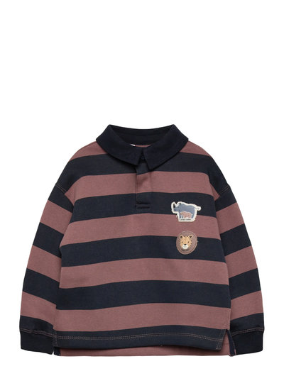 Dieses langärmlige Sweatshirt verfügt über einen klassischen Polokragen mit Knopfverschluss und ein komfortables, gestepptes Baumwoll-Innenfutter. Das gerade geschnittene Oberteil ist aus weichem Baumwollstoff gefertigt und mit einem auffälligen Streifenmuster und aufgestickten Tierapplikationen verziert.