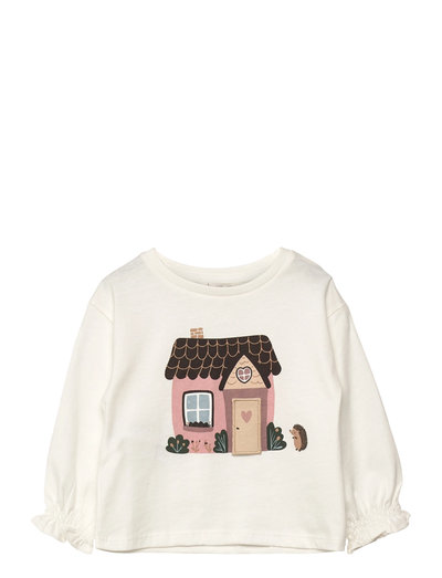 Dieses langärmlige T-Shirt aus weichem Baumwollmischgewebe besticht durch ein charmantes Bild auf der Vorderseite. Das Design verfügt über geraffte Bündchen und dezente Stickereidetails, die der geraden Silhouette eine besondere Note verleihen. Ein klassischer Rundhalsausschnitt vervollständigt dieses bequeme und stilvolle Kleidungsstück.