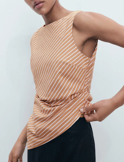 Dieses ärmellose Top besticht durch einen auffälligen, asymmetrischen Saum. Es ist aus einem angenehmen Baumwollmischgewebe gefertigt und vollständig mit Baumwolle gefüttert. Das Design umfasst breite Träger und ein Raffdetail an den Seiten. Ein Knopfverschluss auf der Rückseite rundet das Modell ab.