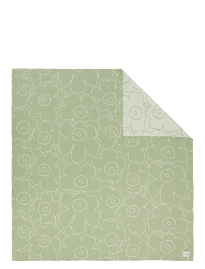 The Piirto Unikko pattern bedspread is made with a jacquard knit. The bedspread is two-sided; one side has a light colored background, while the other side has a darker background.
