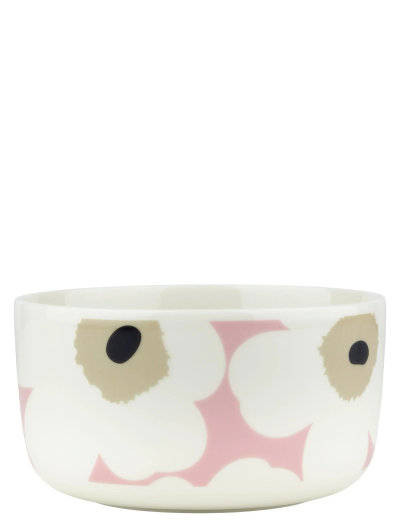 The Oiva bowl with Unikko pattern is made of white stoneware that is dishwasher, oven, microwave and freezer proof.