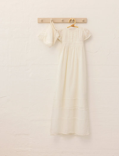 Beautiful and long babtism dress with lovely lace details. The dress has puff sleeves, tie at the waist and button closure at the back