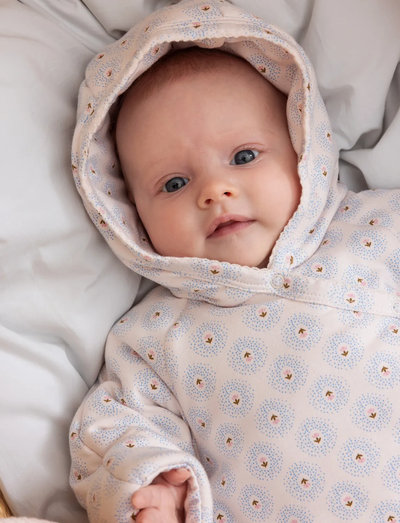 Warm romper with polyester filling, hoodie and buttons closure. The openings at hands and feets can be fold over to keep the baby warm and cosy