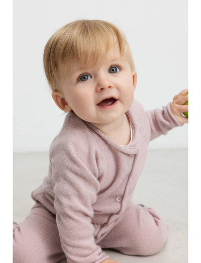 Cashmere cardigan with front button closure, roller edge and raglan sleeve.