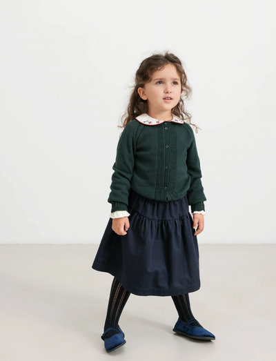 Long-sleeved T-shirt with a pretty collar and floral embroidery. The blouse fastens at the back with buttons