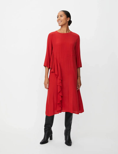 Dieses Midikleid zeichnet sich durch seine kaskadenartigen Rüschendetails aus und sorgt für einen dramatischen Touch. Die fliessende Silhouette und die Dreiviertelärmel machen es zu einer bequemen und dennoch eleganten Wahl für Abendveranstaltungen.