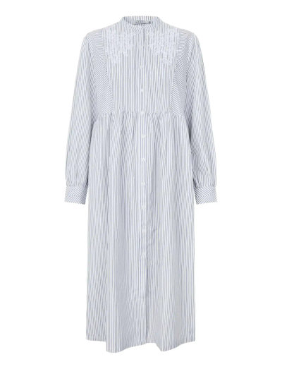Dieses gestreifte Kleid besticht durch einen zarten, bestickten Kragen. Das durchgeknöpfte Design und die langen Ärmel sorgen für eine klassische Silhouette, die sich vielseitig stylen lässt.