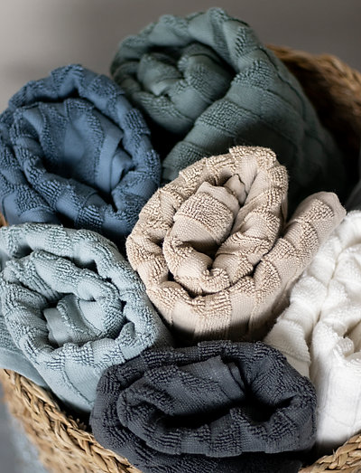 The GEO towels are made with a high-low weaving technique in which the hexagonal shape is split into two halves. It provides an almost three-dimensional, graphic pattern with a light and a dark half. The series also has a matching 50x80 cm bath mat. The towels are made of 100% Oeko-tex-certified cotton, which provides exceptional softness and good absorbency.